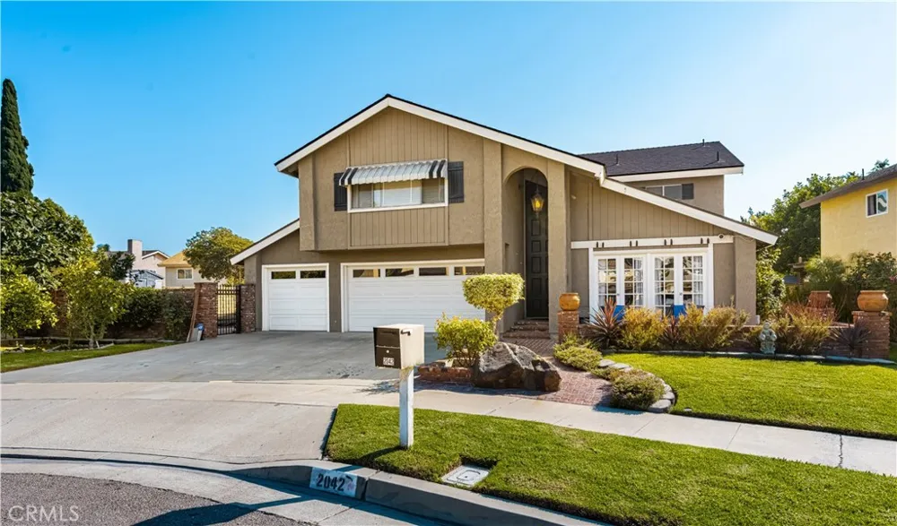 Located in the beautiful City of Orange, this wonderful, multi-generational home, or beautiful home with multiple options, is located at the end of a cul-de-sac beautifully landscaped with roses and cottage garden flowers, and separated by the large three-car driveway is a cute little orchard area with beautiful grapevines, apple trees, papaya, plum, and fig trees. The front yard has a beautiful used-brick courtyard and low fencing, making the grounds charming. The house is approximately 2,700 square feet and includes a large three-car attached garage with three parking spaces and a double-door (looking) entrance opening to the foyer, which has a staircase to the upstairs and a separate entrance to the main living area. As you enter into the main living area, you are welcomed into the charming family room with one of two beautiful fireplaces and open to the country kitchen with newer stainless steel appliances and a farm sink, overlooking the covered back patio and pool area that is ready to be landscaped as beautifully as the front yard. Access from the kitchen leads to the beautiful dining room and living room with high cathedral ceilings and double French doors leading to the front courtyard. Your laundry, full bath, and 4th bedroom are also in the downstairs area, as is access to your three-car garage. Upstairs, there is a beautiful grand suite with its own fireplace, upgraded mirrored wardrobe closet, and a full bath consisting of a separate double sink, vanity area, and walk-in closet, as well as a separate bath, shower, and toilet area. This beautiful suite is extremely large and feels even larger with its cathedral ceilings. The second kitchen, complete with its own laundry, is also on the second floor, as is another full bath, a large bedroom with triple mirrored wardrobe closet doors, and finally a large room, currently being used as another private suite with high cathedral ceilings. All bedroom and bathroom doors have been upgraded, along with other lovely improvements made through the years. This home gives you many options for how to enjoy it and is conveniently located near UCI Medical Center, CHOC, St. Joseph Hospital, Chapman University, and is freeway close to major connections. Angel Stadium, the Honda Center, and Disneyland are also nearby, adding to the incredible convenience and appeal of this beautiful Orange home.