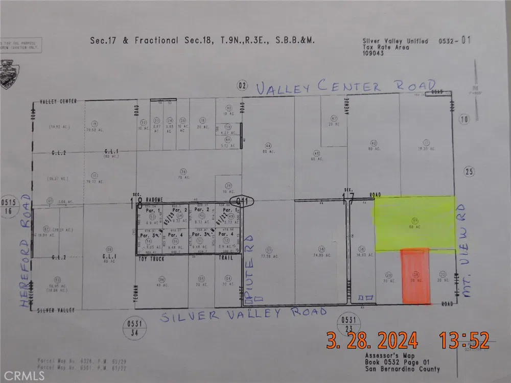Motivated Seller, make offer. PRIME location in Newberry Springs. This has to be one of the best opportunities available in the area. Two adjoining parcels, totaling 80 acres on paved road, centrally located in Newberry Springs. The 20 acre parcel fronts on Silver Valley Road, the 60 acre parcel is behind the 20 acre parcel and has frontage on Mountain View Rd. Palos Verdes Road is at the NE corner of the 60 acre parcel. The parcels are NW of the corner of Silver Valley Rd and Mountain View Rd. The two parcels together are shaped like a "T". The parcel numbers are 0532-011-28 (20 acres) & 0532-011-37 (60 acres). These parcels are located approximately just 660' east of the homes at 44522 Silver Valley Rd. Silver Valley Elementary School is just over a mile east of this property. What a great place this would be to build your ranch. Alfalfa fields are nearby. Lot sizes indicated include both parcels and are taken from tax assessor's public records.